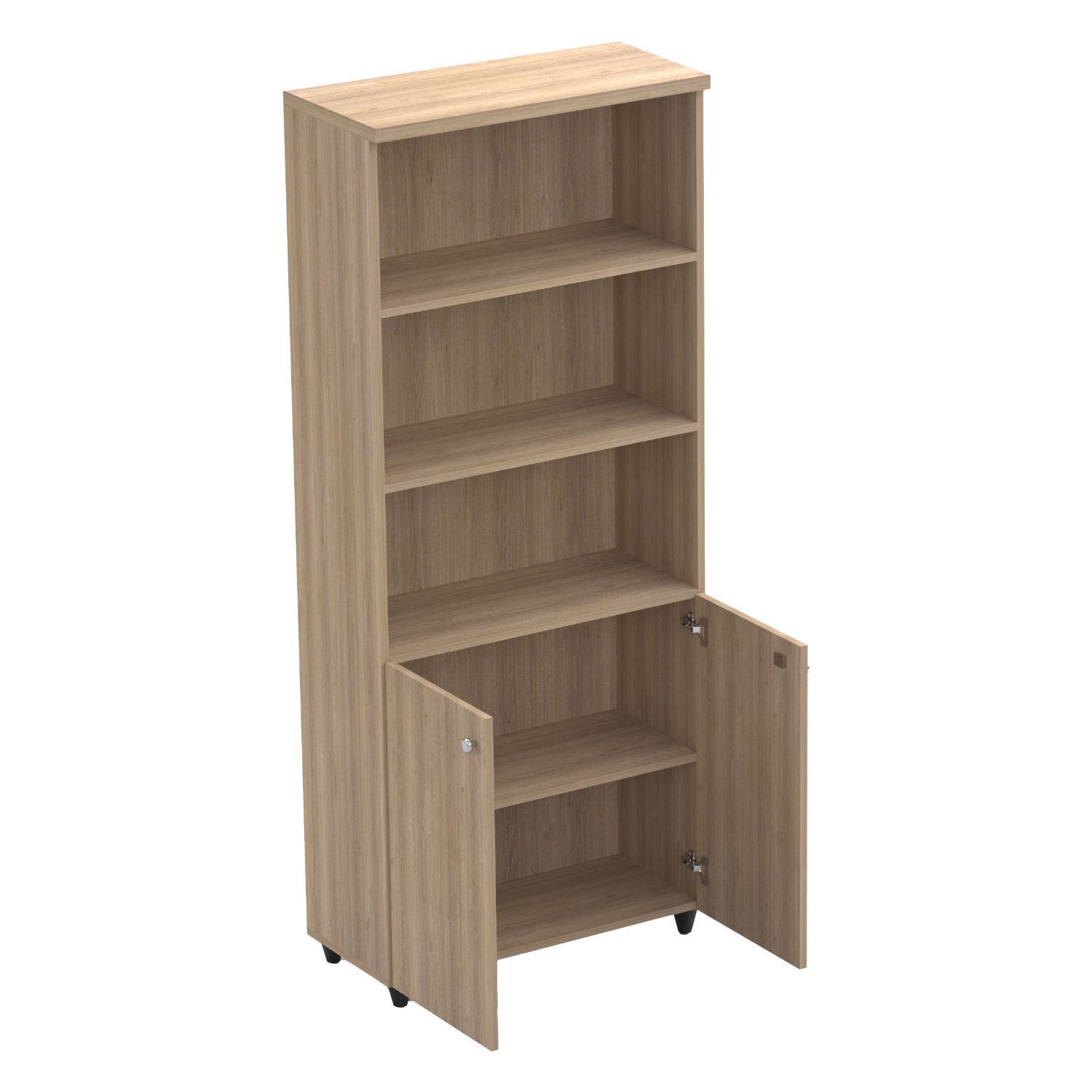 Altı kapaklı, üstü açık raflı ofis dolabı.