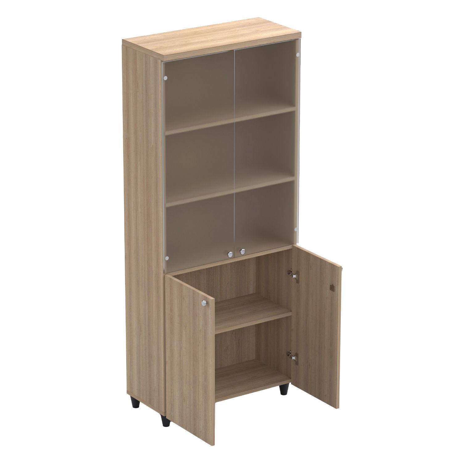 Dört Raflı Yarı Camlı Kapaklı Dolap, üst bölümde cam kapaklı raf sistemi ve alt bölümde kapaklı saklama alanı ile hem şık hem işlevsel bir tasarım sunar. Kurumsal ofislerde prestijli bir görünüm oluşturur.