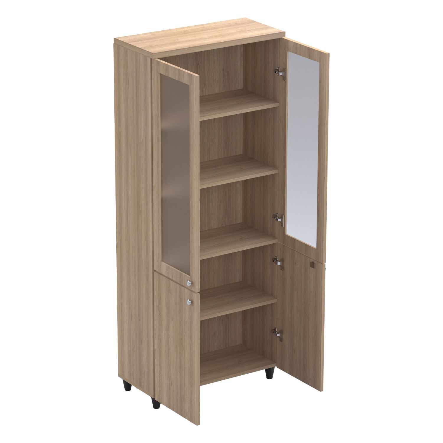 Dört Raflı Yarım Çerçeveli Camlı Kapaklı Dolap, üst bölümde cam detaylı kapak tasarımı ile hem sergileme hem depolama imkânı sunar. Alt bölüm kapaklı yapısı sayesinde evrak ve klasörleri düzenli şekilde saklamaya uygundur.