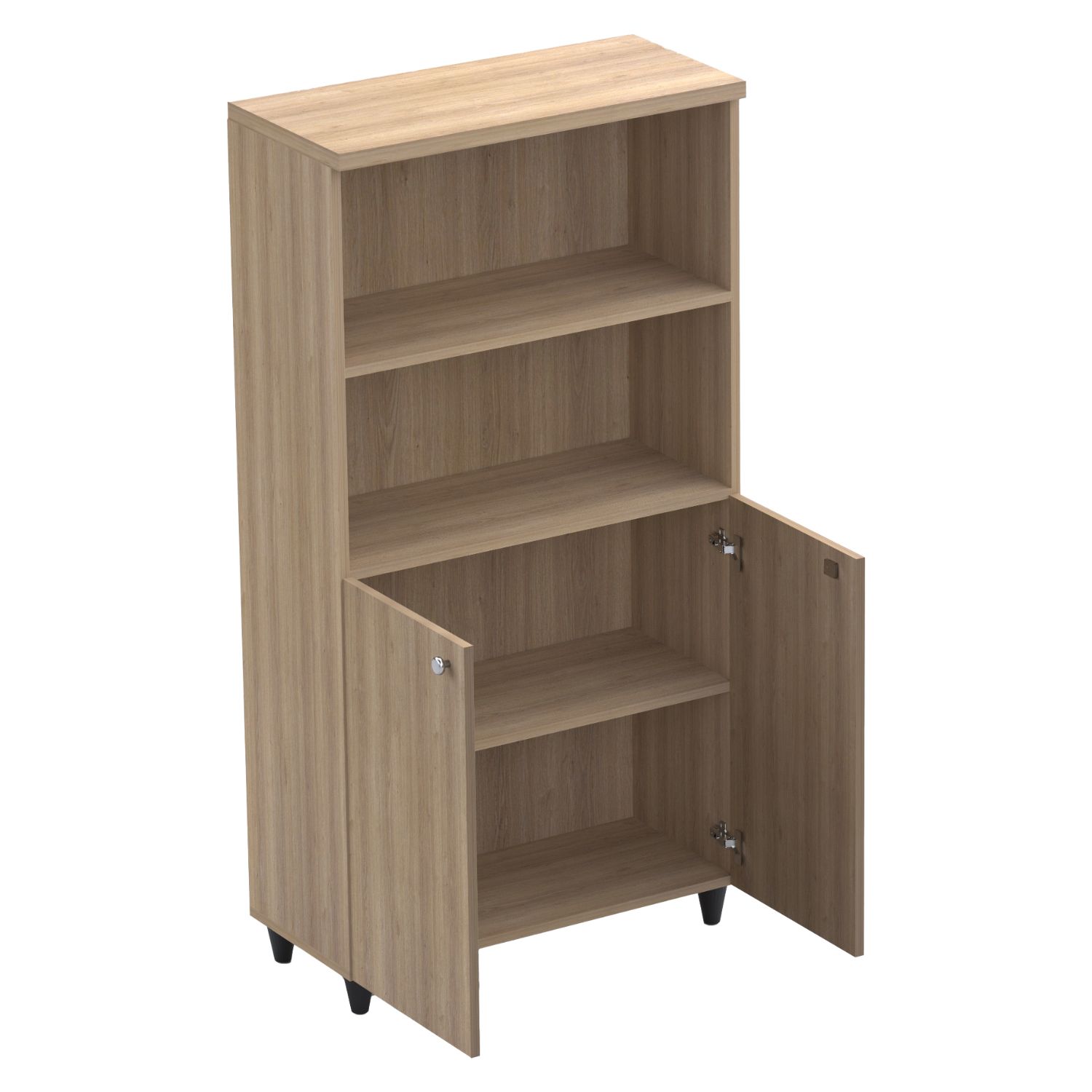 Altı kapaklı, üstü açık raflı ofis dolabı.